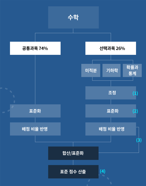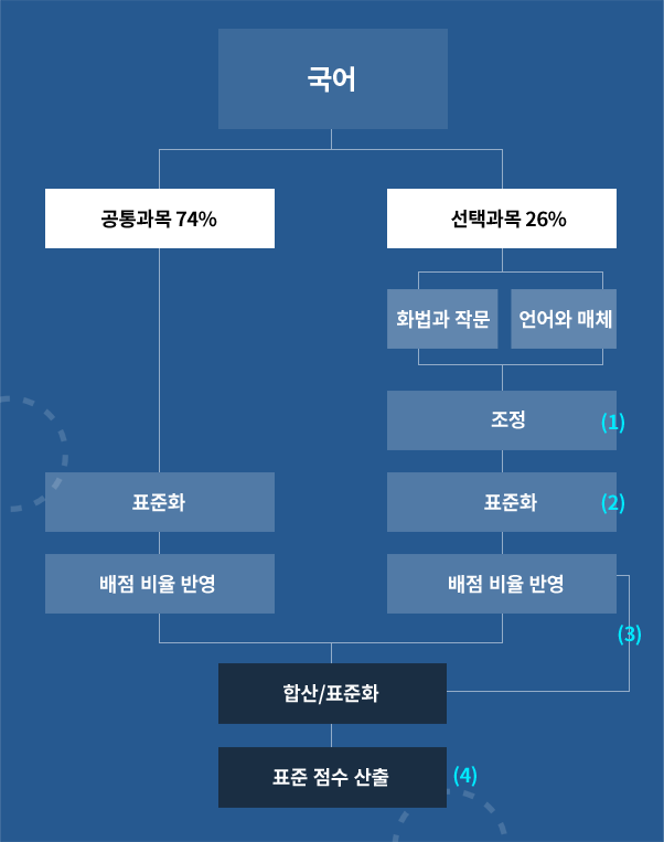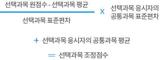 ±¹¾î Ç¥ÁØÁ¡¼ö »êÃâ¹æ¹ýÀº °øÅë°ú¸ñ Ç¥ÁØÈ Á¡¼ö¿Í ¼±Åðú¸ñ Ç¥ÁØÈ Á¡¼ö ºñÁß Àû¿ëÀÌ °¢°¢ 0.75, Àº 0.25ÀÎ °Í(¼öÇÐÀº °¢°¢ 0.76, Àº 0.24) ¿Ü¿¡ ³ª¸ÓÁö´Â ¼öÇРǥÁØÁ¡¼ö »êÃâ¹æ¹ý°ú µ¿ÀÏÇÏ´Ù.